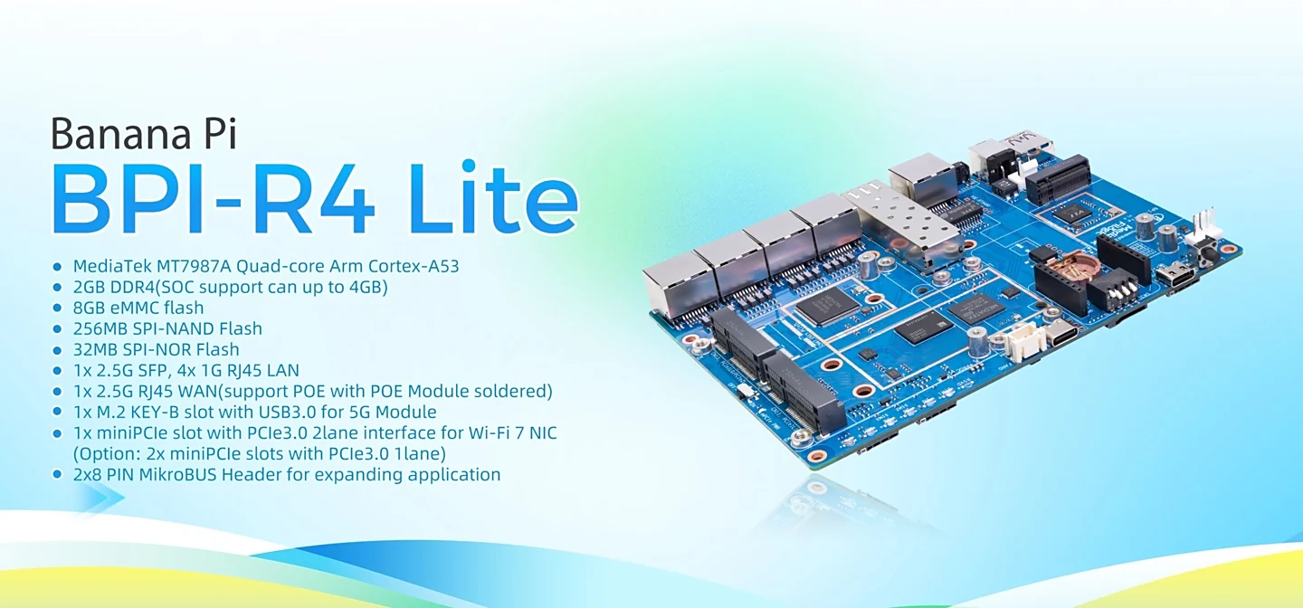 相比较树莓派 5,香蕉派本次推出的 BPI-R4 Lite 单板计算机更适合部署在网络场景下。该单板计算机配备 1 个 2.5G 网口、1 个 2.5G SFP 光模块以及 4 个千兆网口,此外还配有 1 个 mini-PCIe 插槽(双 PCIe 3.0 通道),支持用户安装 Wi-Fi 7 网卡。