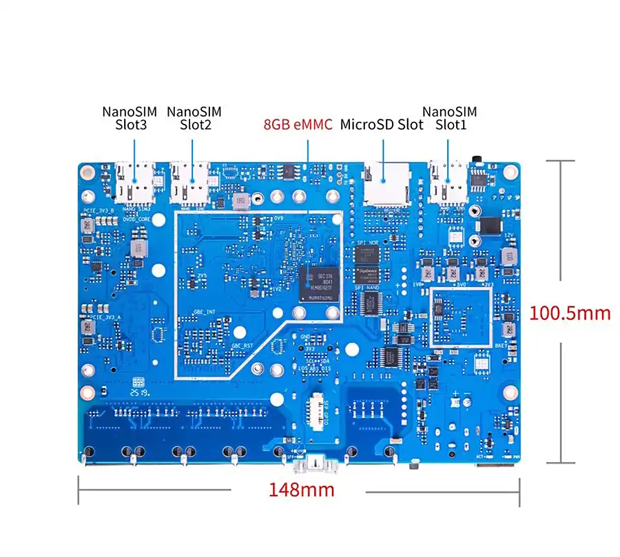 这款单板计算机的处理器是 MediaTek MT7987A SoC,拥有四个 Cortex-A53 核心,并搭配 2GB DDR4 内存和 8GB eMMC 存储,使用 Micro SD 卡。虽然没有标准的 GPIO 引脚头,但可以通过 UART、I2C 和 SPI 连接传感器和执行器。