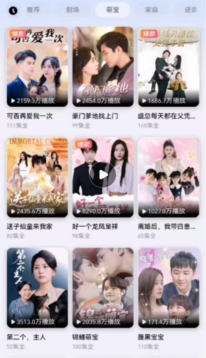 支付宝短剧迷局进入支付宝短剧页面,会发现其内容非常全面,不仅拥有萌宝、家庭、逆袭、重生、甜宠、虐恋、打脸虐渣、大女主等热门短剧主题,而且短剧数量非常多,在一屏九个的短剧页面中,小编多次滑屏,但都没有翻到底页。