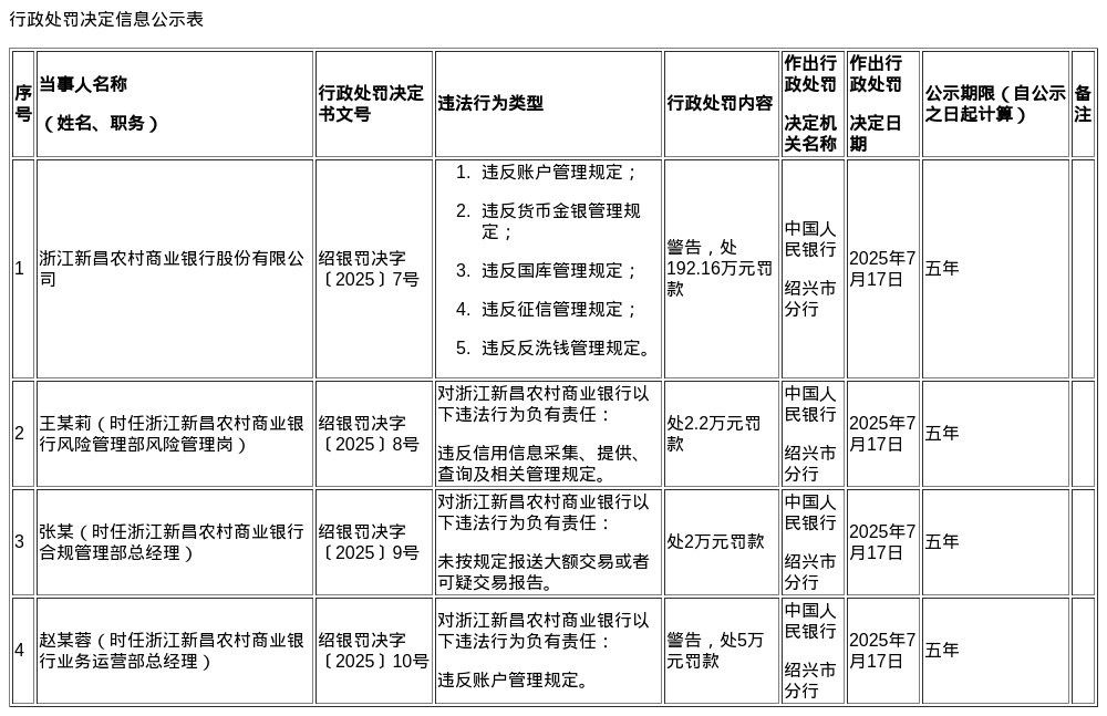 蓝鲸新闻8月1日讯,近日,中国人民银行绍兴市分行公布了多张罚单,剑指浙江新昌农村商业银行股份有限公司及其相关责任人。
